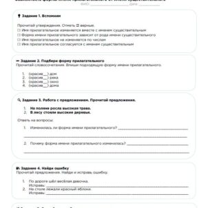 Комментированное выполнение задания по соотнесению формы имени прилагательного с формой имени существительного. Работа в группах: анализ дидактического текста, поиск ошибок на согласование имён существительных и имён прилагательных, исправление найденных ошибок
