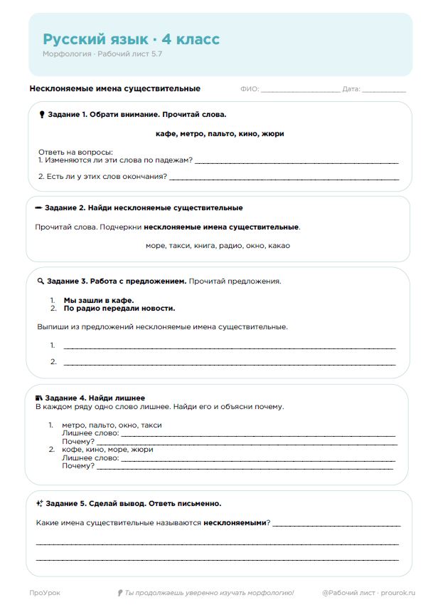 Русский язык, 4 класс морфология. Рабочий лист: Несклоняемые имена существительные