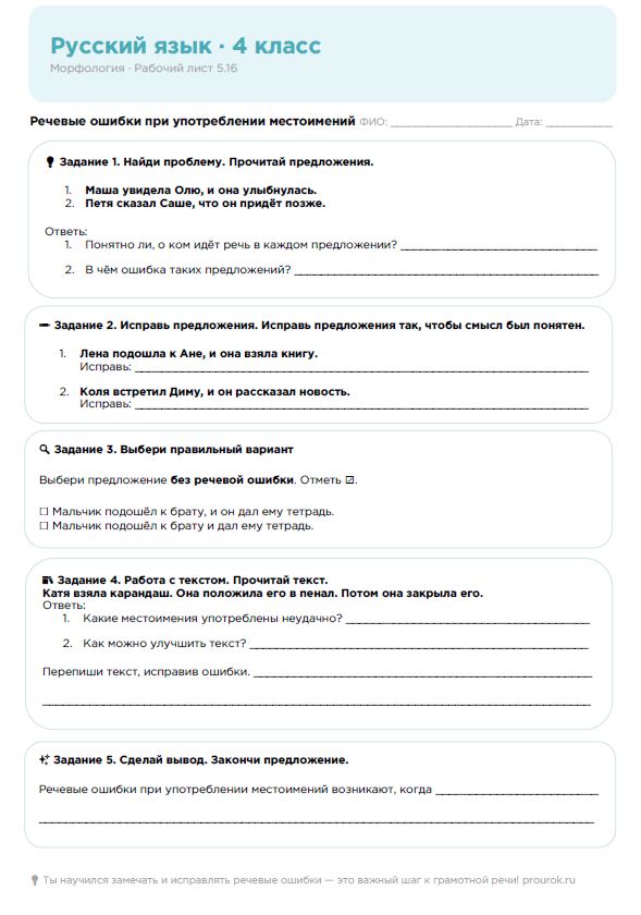 Русский язык, 4 класс морфология. Рабочий лист: Речевые ошибки при употреблении местоимений