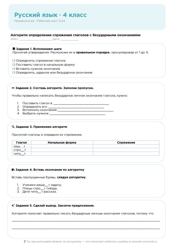 Рабочий лист направлен на закрепление чёткого алгоритма работы с безударными личными окончаниями глаголов. Учащиеся учатся действовать по шагам и избегать ошибок при письме.