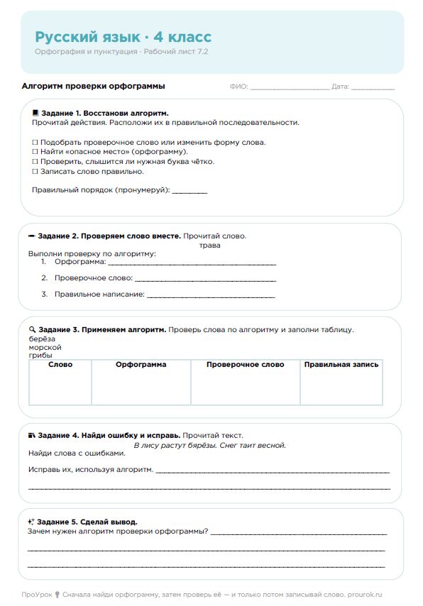Русский язык, 4 класс. Орфография и пунктуация. Рабочий лист: Алгоритм проверки орфограммы