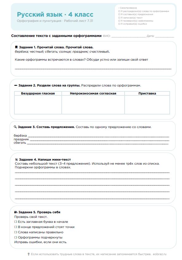 Русский язык, 4 класс. Орфография и пунктуация. Рабочий лист: Составление текста с заданными орфограммами