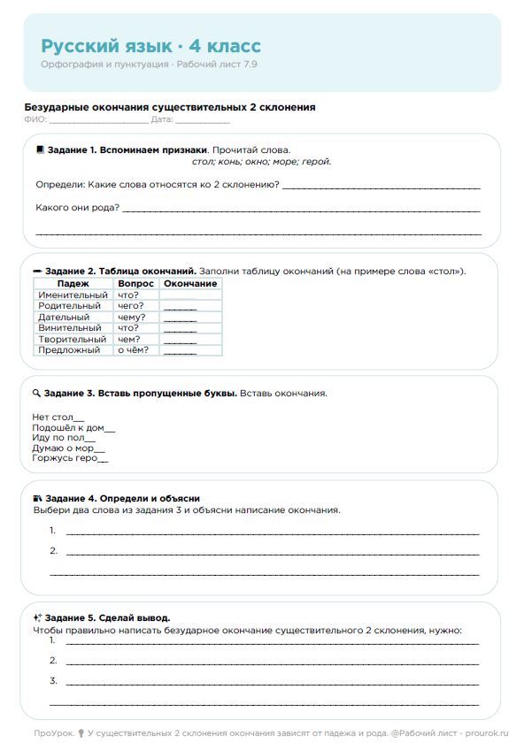 Русский язык, 4 класс. Орфография и пунктуация. Рабочий лист: Безударные окончания существительных 2 склонения