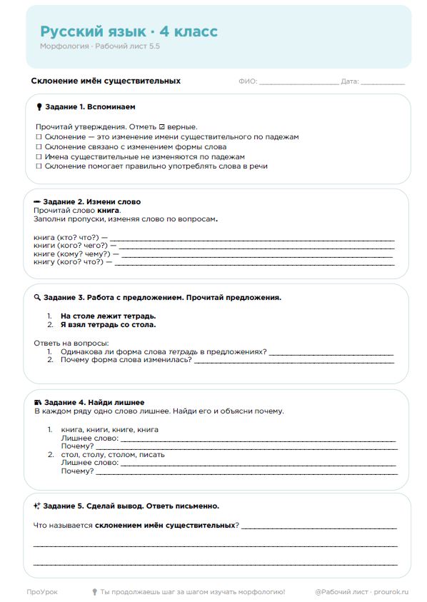 Рабочий лист предназначен для изучения склонения имён существительных как изменения по падежам. Материал помогает учащимся понять, почему форма слова изменяется в речи.
