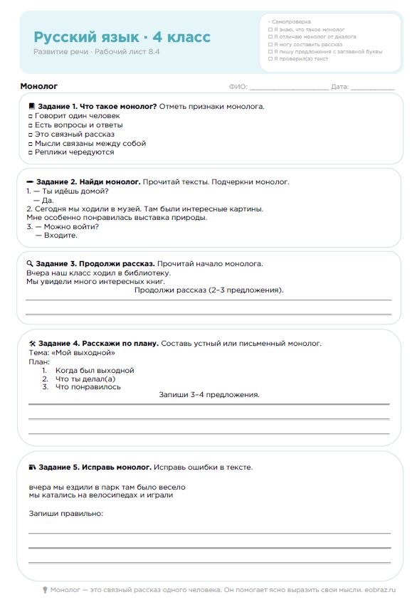Русский язык, 4 класс. Развитие речи. Рабочий лист: Монолог