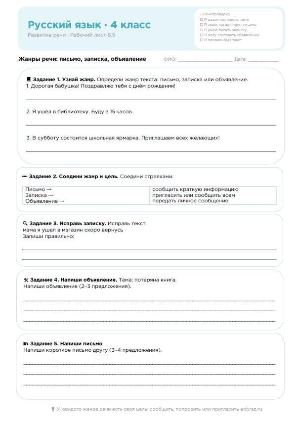 Русский язык, 4 класс. Развитие речи. Рабочий лист: Жанры речи — письмо, записка, объявление