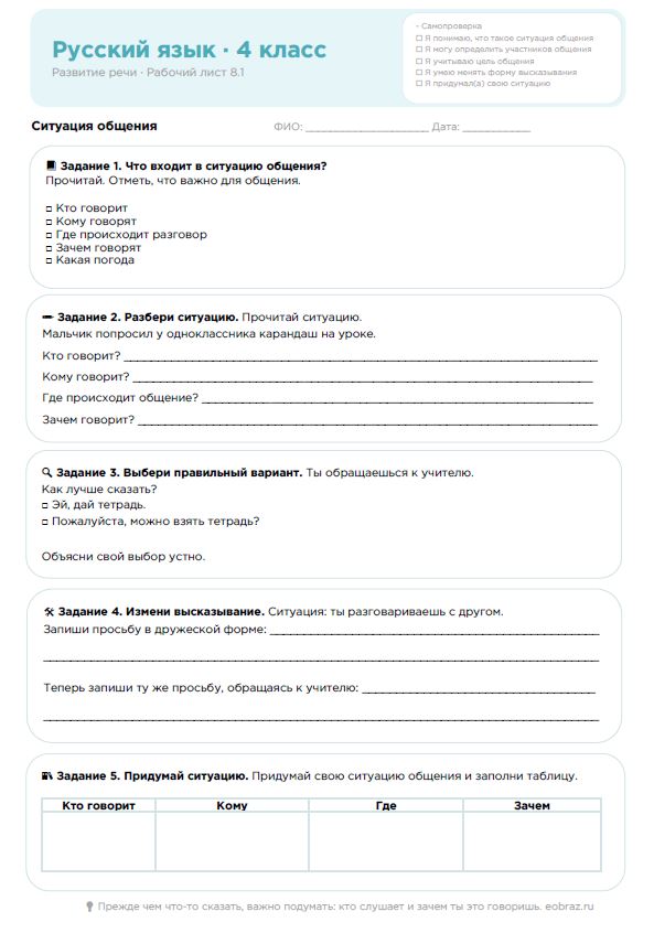 Русский язык, 4 класс. Развитие речи. Рабочий лист: Ситуация общения