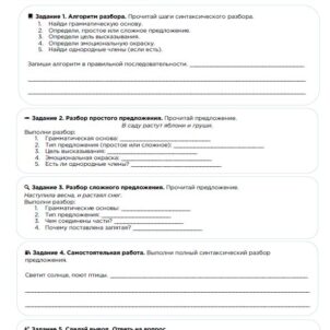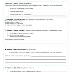 Рабочий лист формирует умение различать простые предложения с однородными членами и сложные предложения с двумя основами. Подходит для закрепления и подготовки к контрольной работе.
