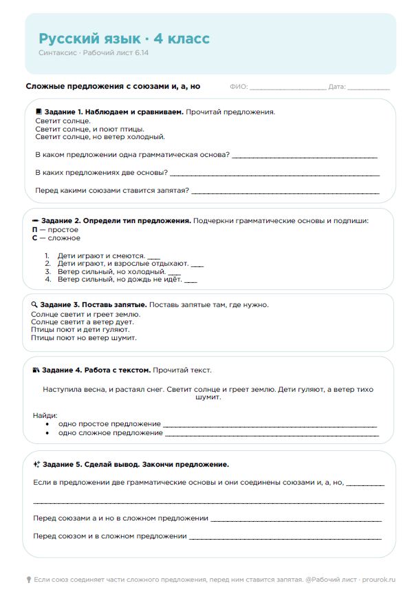 Русский язык, 4 класс. Синтаксис. Рабочий лист: Сложные предложения с союзами и, а, но