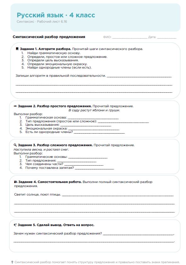 Русский язык, 4 класс. Синтаксис. Рабочий лист: Синтаксический разбор предложения (алгоритм и практика)